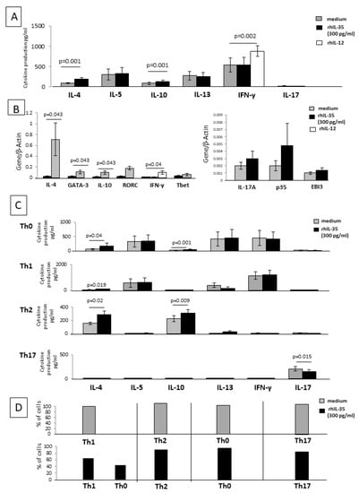 In the presence of rhIL-35, the levels of IL-5, IL-13, IFN-γ, and IL-17A produced by the Th0 cells were not modified, whereas the levels of IL-4 (p = 0.04) and IL-10 (p = 0.001) were significantly increased in the presence of rhIL-35 compared to those found in the absence of rhIL-35 (Figure 4C).