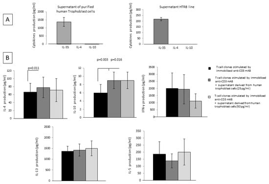 IL-4 production was significantly increased when CD4+ T-cell clones were cultured in the presence of trophoblast cell supernatants containing 25 pg/mL of IL-35 (but not IL-4 and IL-10) (p = 0.011), compared to T-cell clones cultured without trophoblast supernatants. Moreover, IL-10 was significantly increased when CD4+ T-cell clones were cultured in the presence of trophoblast cell supernatants containing 25 pg/mL of IL-35 (p = 0.003) and 50 pg/mL of IL-35 (p = 0.016) (but not IL-4 and IL-10) compared to T-cell clones cultured without trophoblast supernatants. No significant difference was observed for the levels of the other Th2-type cytokines, IL-13 and IL-5, and for IFN-γ productions by CD4+ T-cell clones in the presence of trophoblast cell supernatants and T-cell clones cultured without trophoblast supernatant (Figure 5B).
