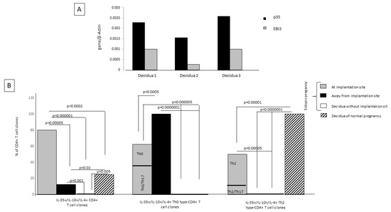 When observing the expression of mRNA for p35 and EBI3, the two co-expressed subunits of IL-35, in three human decidual specimens obtained from women with normal pregnancy during the first trimester of gestation, we found that IL-35 is expressed at the decidual level (Figure 7A). Despite Ebi3 and p35 mRNA having been shown to be co-expressed in trophoblast cells, they were not detected in first-trimester decidua stromal cells [15]. These results suggest that IL-35 expression at the decidual level is derived from decidual T cells and not from stromal cells. For this, we derived and analyzed T-cell clones from first-trimester deciduae of normal pregnancy and from the embryo implantation site. We generated 70 CD4+ T-cell clones from ectopic tubal pregnancies at the implantation site and far from the implantation site and also from the deciduae of the same women with ectopic pregnancy, where the implantation site was not present in the decidua but in the fallopian tube, and from the deciduae of women with normal pregnancy with an implantation site.