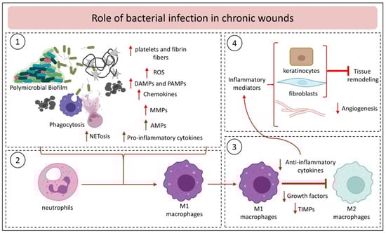 Role of bacterial infection in chronic wounds during the four phases of wound healing. Excessive inflammation is the main cause of chronicity and disruption of normal healing phases ((1) homeostasis, (2) inflammation, (3) proliferation, and (4) tissue remodeling phase; see text in Section 2. Chronic wounds). This inflammation is maintained by chronic activation of the innate immune system, which is driven by its interactions with and responses to polymicrobial biofilms formed within the wound. The response of the innate immune system (see Figure 3) is tightly coupled to the release of soluble mediators like reactive oxygen species (ROS), pro-inflammatory cytokines, chemokines, matrix metalloproteinases (MMPs), and antimicrobial peptides and proteins (AMPs), as well as damage-associated molecular patterns (DAMPs), pathogen-associated molecular patterns (PAMPs), neutrophil extracellular traps (NET)-osis, and the tissue inhibitor of metalloproteinases (TIMPs). This tight interplay between bacterial infection and immune responses is the major causes of chronic inflammation that prevents the initiation of the proliferative phase of healing.