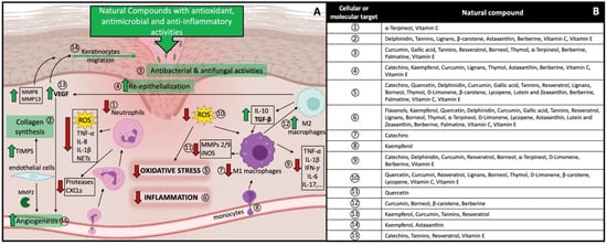 Graphical representation of infected chronic wound treated with natural bioactive compounds. (A) Molecular pathways and main targets affected by the natural compounds described in the manuscript are indicated. The arrows indicate the effects on the targets upon treatment. The numbers refer to respective targets and the natural compounds that seem to be best for the treatment as shown in (B).