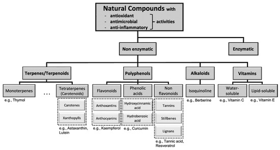 The following subsections will give an overview of selected, well-characterized natural antioxidants together with their anti-bacterial and anti-inflammatory properties. Figure 5 shows selected natural compounds and their cellular/molecular targets in the different pathways connected to wound healing.