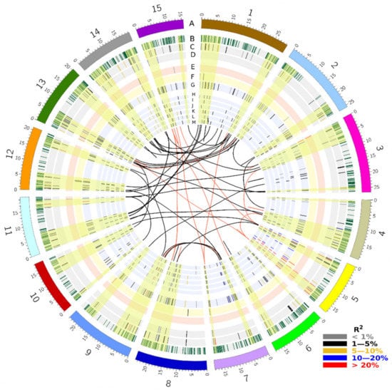 - Remington, D.L.; Thornsberry, J.M.; Matsuoka, Y.; Wilson, L.M.; Whitt, S.R.; Doebley, J.; Kresovich, S.; Goodman, M.M.; Buckler, E.S. Structure of linkage disequilibrium and phenotypic associations in the maize genome. Proc. Natl. Acad. Sci. USA 2001, 98, 11479–11484. [Google Scholar] [CrossRef]
