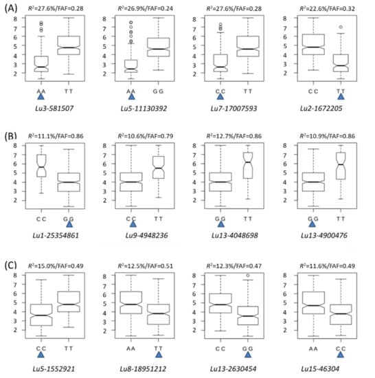 | Lus10019708 | 13 | 4520377 | 4539065 | TNL | Lu13-4531367 | T/C | T | 0.39 | 29.66 | −0.73 | 14.08 |