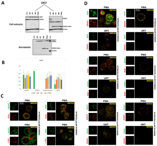 The following mouse monoclonal antibodies were used: anti-ERAP1 (mAb clone B-10, sc-271823 Santa Cruz, Dallas, TX, USA), anti-ERAP2 (mAb clone 3F5, MAB 3830 R&D Systems) [37], anti-IRAP (mAb F-5 sc-365300, Santa Cruz, Dallas, TX, USA), anti-β-Actin (mAb clone C4, sc-477778 Santa Cruz, Dallas, TX, USA), anti-CD14 (mAb UCHM1, Abcam, Cambridge, UK), anti-MS4A4A (mAb MAB7797-SP, R&D), and anti-EEA1 (mAb MA5-31575, Invitrogen, Carlsbad, CA, USA).