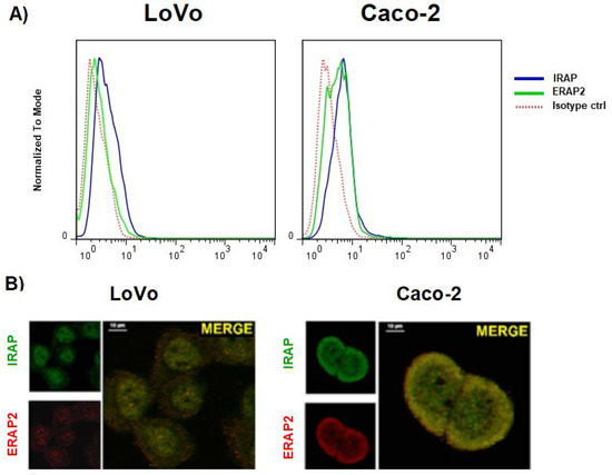 ERAP2 and IRAP expression in LoVo and Caco-2 cell lines. (A) Cytofluorimetric analysis of the cell membrane expression of ERAP2 (green) and IRAP (blue). LoVo cells express no ERAP2 in the cell membrane, whereas CaCo-2 cells do. IRAP is equally expressed in both cells. (B) Confocal analysis of the intracellular expression of ERAP2 (red) and IRAP (green) in the same samples. Scale bar: 10 µm. Results shown are representative of three independent experiments.