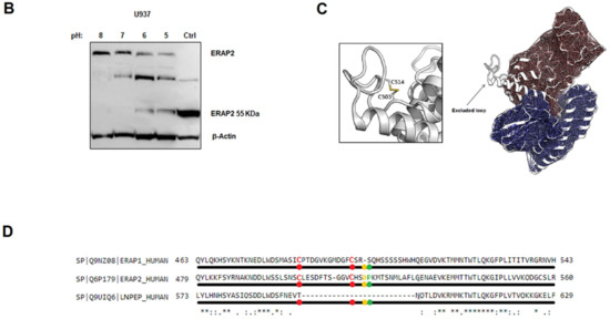 In order to gain structural insights into the mechanism of the cleavage observed in ERAP2, but not in the closely related ERAP1 and IRAP, the crystal structure of ERAP2 (PDB: 5AB0) was investigated and compared to the other two aminopeptidases [28]. In the case of ERAP2, the protein structure shows the presence of a unique extended loop, encompassing residues 500–520 (Figure 4C). This distinctive structural motif is peculiar of ERAP2 and contains two potential sites, which could be sensitive to low pH regulation: (1) a disulfide bridge formed by Cys 503 and Cys 514, which might be broken at low pH values and (2) a specific Asp-Pro motif (Figure 4D). However, while the disulfide bridge is also conserved in ERAP1, the Asp-Pro motif is unique of ERAP2. This site has been reported to be particularly sensitive to pH variations [29] and it could represent a weak structural site that, when in an acidic micro-environment, can determine the breakage and thus generate the N-terminus ~55 kDa fragment recognized by the anti-ERAP2 MoAb.