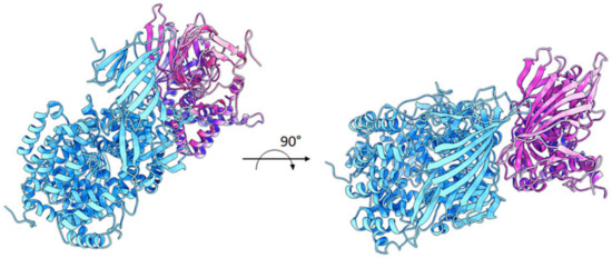 A possible model of the ~55 kDa fragment of ERAP2 bound to IRAP was also investigated by protein–protein docking means to tentatively explain the strong affinity observed in the co-immunoprecipitation experiments. As shown in Figure 5, ERAP2 is predicted to form a pseudo-symmetric heterodimer with IRAP, with the N-terminal β-sheet-rich region of ERAP2 (residues 50–170) making extensive contacts with the corresponding region of IRAP. The predicted ΔG of binding and dissociation constant (Kd) values were −15.5 Kcal/mol and 4.3 e−12, respectively, which is indicative of a strong affinity between the two proteins. Moreover, the large amount of surface area buried upon interaction and the complementarity of the surface charge validate a plausible mechanism of dimerization, which could account for the specific interaction observed in vitro.