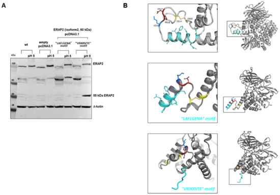 Expression and proposed model of the truncated proteins. (A) Western blot of the truncated proteins transfected into Hek293T cells. Plasmids containing the sequence reported in Figure S1 corresponding to ERAP2/iso2 were transfected into Hek293T cells. The first four lanes are controls (Hek293T cells and Hek293T cells transfected with the vector pcDNA3.1). Lanes 5 and 6 report respectively the untreated or acid-treated Hek293T cell lysates previously transfected with the plasmid expressing the 534 aa of the haplotype A (A at rs2248374). Lanes 7 and 8 report respectively the untreated or acid-treated Hek293T cell lysates previously transfected with the plasmid expressing the 532 aa corresponding to the haplotype G (G at rs2248374). To note: when treated at pH 5 before running, the samples move slightly slower than the untreated counterpart. (B) Modelling of the two truncated proteins. Rosetta 3.13 Linux version was used to predict the conformation of the two “short” ERAP2 carrying either the LAFLGENA or the VRIKRVTE motif. The initial atomic coordinates were taken from the X-ray crystal structure of ERAP2 (Protein Data Bank ID: 5AB0). The Python protocol which makes use of the Rosetta 3.13 neural network to generate inter-residue distance and orientation constraints for a sequence of unknown structure, was used. The Rosetta minimizer was then used to find the backbone conformation consistent with the constraints.
