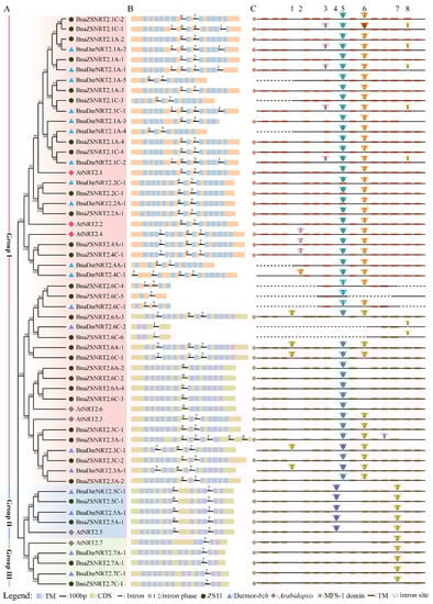 Phylogenetic tree and sequence structures of the candidate NRT2s in B. napus and Arabidopsis. (A) Neighbor-joining (NJ) phylogenetic tree of NRT2s in B. napus and Arabidopsis. Different background colors represent different groups. (B) Gene structures of NRT2s in B. napus and Arabidopsis. Exons are shown by yellow boxes, transmembrane (TM) domains are shown by blue boxes, and the lines between the colored boxes correspond to the introns. Numbers 0, 1, and 2 represent introns phase 0, 1, and 2, respectively. (C) Intron insertion patterns of NRT2s in B. napus and Arabidopsis. The top numbers (1–8) indicate the orders of the 8 conserved intron sites. The triangles represent different intron insertion sites. Each column (triangle with the same color and number) represents the same intron insertion site and phase. The dashed lines represent the severely missing sequences of candidates.
