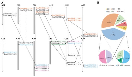 Chromosome distribution and duplication of BnaZSNRT2s. (A) 31 BnaZSNRT2s were mapped on 12 chromosomes in B. napus. The genes in orange and blue originated from B. rapa and B. oleracea, respectively; genes in purple were involved in segmental exchange (SE) events; the genes with green frames were tandem duplication (TD) pairs. The black and dashed lines with an arrow represent the duplication direction of genes involved in segmental duplication (SD) and homologous exchange (HE) events, respectively. (B) The big pie chart represents the percentage of BnaZSNRT2s derived from SD, SE, HE, TD, and orthologous region (OR) events, respectively; the left small pie chart represents the percentage of BnaZSNRT2s from OR and then experienced small duplication events in B. napus, and the right small pie chart represents the percentage of BnaZSNRT2s involved in OR events from B. rapa and B. oleracea.