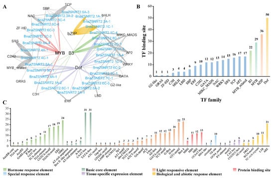 Transcription factor (TF) binding network and cis-element analysis in the promoter regions of BnaZSNRT2s. (A) The potential TF binding network of the 31 BnaZSNRT2s predicted by the PlantTFDB tool. (B) The TF gene families with potential binding sites in the promoter regions of the BnaZSNRT2s. (C) The cis-elements in the promoter regions of the BnaZSNRT2s. The ordinate represents the number of BnaZSNRT2s.
