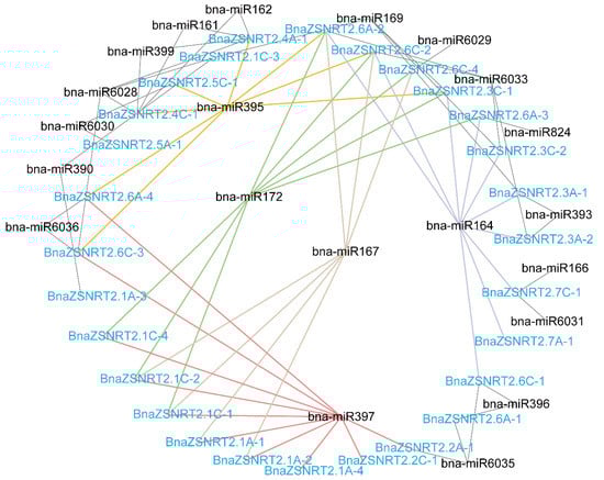 The potential miRNA targeting network of the BnaZSNRT2s. A total of 21 miRNAs with black were predicted. BnaZSNRT2s were represented in blue.
