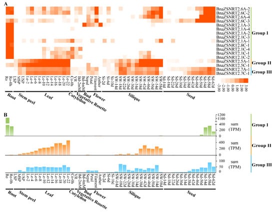 Expression pattern of BnaZSNRT2s in B. napus at different developmental stages. (A) The expression profile of BnaZSNRT2s in 52 tissues. (B) The sum of expression levels in Group I−III. The ordinate represents the sum of expression levels (TPM). “Ro” = root, “LSP” = lower stem peel, “MSP” = middle stem peel, “USP” = upper stem peel, “Le” = leaf, “Co” = cotyledon, “VR” = vegetative rosette, “Bd” = bud, “Si” = silique, “SW” = silique wall, “Sd” = seed; “h,” and “d,” indicate hour and day, respectively.