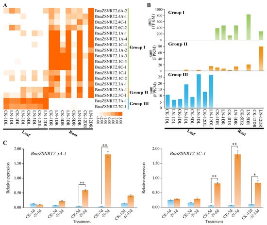 To discover the potential functions of BnaZSNRT2s in the N utilization process in B. napus, an LN stress RNA-seq dataset (PRJNA612634) was applied in this study. Excepting 13 BnaZSNRT2s that were not expressed (FPKM < 1) in all samples, the last 18 expressed BnaZSNRT2s belong to three groups (Figure 6A). Consistent with the large number, up to 14 members in Group I had detectable transcript accumulation (FPKM ≥ 1) in the dataset, which was preferentially expressed in roots. Their expressions were significantly up-regulated under LN treatment after 3-, 5-, and 12-days (Figure 6B). Moreover, their expression patterns were somewhat different: BnaZSNRT2.6A-2, BnaZSNRT2.4A-1, BnaZSNRT2.6C-2, and BnaZSNRT2.4C-1 were obviously preferentially up-regulated after 12 days LN treatment in roots; BnaZSNRT2.1A-2, BnaZSNRT2.1A-3, BnaZSNRT2.1C-3, and BnaZSNRT2.8C-1 were significantly up-regulated after 5- and 12-days LN treatments; and the rest 6 members were up-regulated after 3-, 5- and 12-days LN treatment. This implicated the expression profile diversification of the homologs in Group I. Consistent with the spatial-temporal expression profile (Figure 5), the genes in Group II (BnaZSNRT2.5A-1 and BnaZSNRT2.5C-1) and III (BnaZSNRT2.7A-1 and BnaZSNRT2.7C-1) had highly conserved expression patterns under LN treatments respectively. The expressions of BnaZSNRT2.7A-1 and BnaZSNRT2.7C-1 in Group III were slightly up-regulated after 3-, 5- and 12-days LN treatment (Figure 6B). Whereas the expression levels of BnaZSNRT2.5A-1 and BnaZSNRT2.5C-1 in Group II were dramatically increased in roots after 12-days of LN treatment. Their expression levels were both peaked in leaf and roots after 12-day LN treatment, showing long-term N deficiency expression profiles. Notably, BnaZSNRT2.5A-1 and BnaZSNRT2.5C-1 showed very low expression levels in normal conditions in roots (Figure 5A), but their expressions were significantly up-regulated in roots under LN stress (Figure 6A), indicating their potential roles in roots in response to LN stress. To confirm the LN-induced expression profiles of BnaZSNRT2.5A-1 and BnaZSNRT2.5C-1 obtained from the RNA-seq dataset, an RT-qPCR assay was further applied. As shown in Figure 6C, the expression profiles of BnaZSNRT2.5A-1 and BnaZSNRT2.5C-1 were similar and were significantly up-regulated after long-term LN treatments, supporting the credibility of RNA-seq analysis. Notably, a peak expression level was observed at 7 days under LN treatment in the RT-qPCR assay, suggesting their expression trend under the LN stress condition.