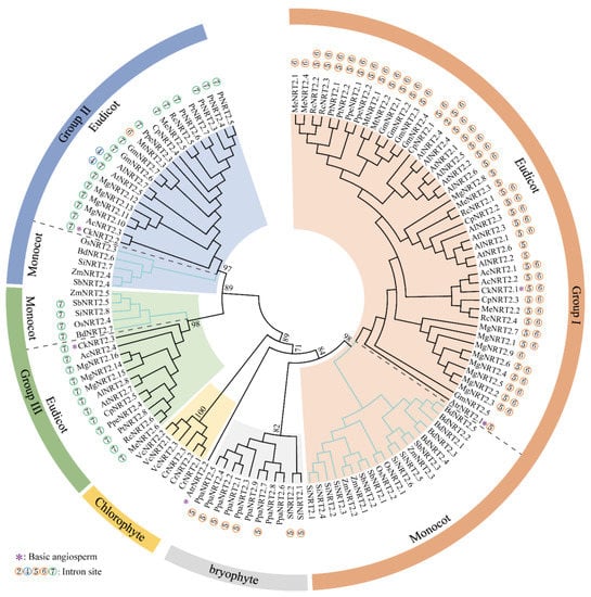 To date, the NRT2 gene family has been identified in numerous plant genomes, such as Brachypodium [], rice [], barley [], M. esculenta [], and A. thaliana []. These studies generally classified this gene family into three groups, namely I−III. To gain insights into the evolutionary mechanisms and sequence features of the NRT2 gene family in the plant kingdom, we further identified the candidates in 22 plant genomes in Phytozome v13 ranging from chlorophyte to angiosperms, including C. reinhardtii, V. carterigenomes, P. patens, S. fallax, A. trichopoda, C. kanehirae, A. coerulea, A. lyrata, A. thaliana, C. papaya, G. max, M. esculenta, M. guttatus, M. truncatula, P. persica, P. trichocarpa, R. communis, B. distachyon, O. sativa, S. bicolor, S. italica and Z. mays. The NRT2s were observed in all of these species, with the number ranging from 2 (A. trichopod and S. fallax) to 16 (M. guttatus) (Table S9). Consistent with previous studies [,], based on the systematic identification and phylogenetic analyses, we divided this gene family into five groups, including Group I (homologs of AtNRT2.1−AtNRT2.4 and AtNRT2.6), Group II (homologs of AtNRT2.5), Group III (homologs of AtNRT2.7), chlorophyte-specific group (Group IV), and bryophyte-specific group (Group V) (Figure 7). Interestingly, we found that the intron distribution trend was highly consistent with the phylogenetic relationship of this gene family in viridiplantae: the genes with both introns “5” and “6” in angiosperms except monocots were observed in Group I. The genes with both introns “4” and “7” were clustered in Group II, and those with only intron “7” were in Group III. Notably, though the genes in dicots and monocots were commonly clustered into each of the angiosperm-specific groups (I−III), members of these two lineages shared the same intron pattern only in Group III, and the monocot genes in the last two groups were generally intron-less instead. Overall, our analyses indicated that the intron patterns might reflect the phylogeny of NRT2s even in an evolutionary context.
