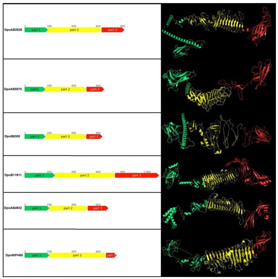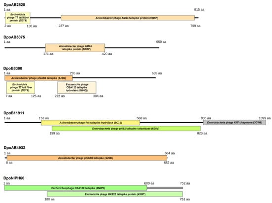 A. baumannii B8300 genome (CP021347) was conventionally designated as DpoB8300, etc. Since the proteins, DpoAB2828, DpoAB5075, DpoB8300, DpoB11911, DpoAB4932, and DpoNIPH60, were found to be structurally similar to tailspikes of different virulent phages (