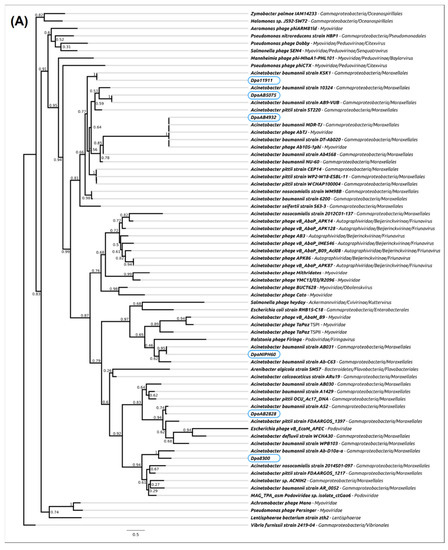 BLASTp analysis revealed that predicted depolymerases DpoAB2828, DpoAB5075, DpoB8300, DpoB11911, DpoAB4932, and DpoNIPH60 were completely identical to different proteins encoded in various A. baumannii genomes (GenBank: WP_002009999, WP_000729646, WP_049590628, WP_053093879, WP_000224779, and WP_004840621, respectively).