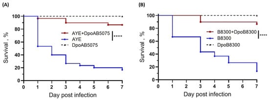 A. baumannii AYE) of (i) bacteria only, and (ii) bacteria administered together with the depolymerase (2 μg per larvae). Three control groups were used: uninfected larvae, larvae injected with saline solution, and larvae injected with depolymerase. Infected larvae were incubated at 37 °C for 7 days and mortality was recorded daily. Each test was performed in triplicate, with 10 larvae per trial. The GraphPad Prism software (GraphPad Software, Inc., La Jolla, CA, USA) was used for statistical analysis and graphical presentation of the results. Statistical analysis was performed for pairwise comparisons between larvae infected with bacteria only and larvae infected with bacteria simultaneously with depolymerase using log-rank (Mantel-Cox) test. Values of