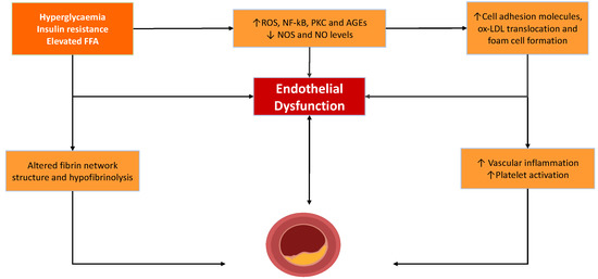 Upon the rupture of the atherosclerotic plaque, a cascade of events ensues that results in the activation of both the cellular and acellular arms of coagulation, promoting thrombus formation. NO once again plays a vital role in the regulation of platelet adhesion and aggregation, normally preventing thrombus formation by inhibiting platelet adhesion and aggregation, while also promoting the disaggregation of pre-formed platelet aggregates [28]. Thus, when NO bioavailability falls in diabetes, the consequence is an increased potential for platelet activation and thrombus formation, also contributing to an inflammatory state [25]. The activation of platelets facilitates the localised activation of the coagulation cascade and the generation of a fibrin network that stabilises the thrombus. DM is characterised by dense fibrin networks and hypofibrinolysis [29,30,31], which contribute to vascular complications and adverse clinical outcomes in this population [32,33] (Figure 1).