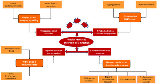 Cardiovascular complications represent the leading cause of morbidity and mortality in patients with diabetes (DM), increasing the economic burden on healthcare systems [1,2,3]. There is an elevated risk of a first vascular event in individuals with diabetes, and outcomes following vascular ischaemia are inferior compared to those with normal glucose regulation [4]. The increased cardiovascular morbidity in subjects with DM is associated with profound metabolic and functional changes in the cells of the vasculature. In the context of the current evidence, the premature and more extensive vascular disease is coupled with a prothrombotic environment in which platelet hyperactivity is thought to play a key role in the suboptimal clinical outcomes. Oxidative stress, dyslipidaemia, and a combination of insulin resistance/hyperglycaemia, typical of patients with DM, have been proposed to contribute to abnormal platelet function [5,6]. The pervading view of the role of platelets in the development of cardiovascular complications in this cohort is focused on their contribution to arterial thrombosis at sites of plaque rupture. Antiplatelet agents, including aspirin, ticagrelor, and clopidogrel, are routinely used to suppress platelet function and reduce the risk of atherothrombosis [7,8,9]. However, there is emerging evidence to indicate that platelets may also contribute to the pervasive low-grade inflammation that promotes increased cardiovascular risk in DM [10,11,12,13].