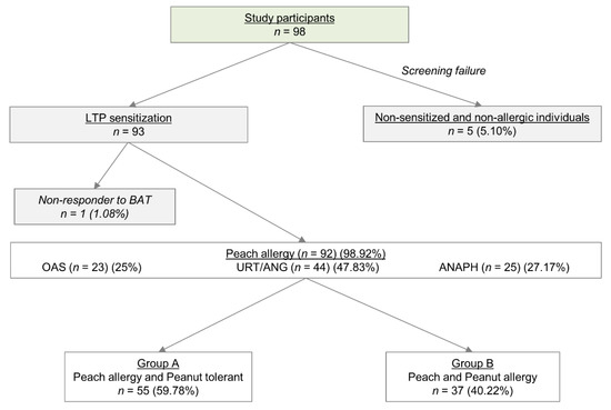 Flow chart of the patient classification. Nonresponder patients in BAT, and nonsensitized and nonallergic individuals were excluded from the study. The remaining patients were classified according to clinical history into three severity groups: oral allergy syndrome (OAS), urticaria/angioedema (URT/ANG), and anaphylaxis (ANAPH). Furthermore, these peach-allergic patients were divided into patients allergic to peach (Group A) and individuals allergic to peach and peanut (Group B). These groups of patients were used to compare them in clinical and BAT parameters terms.