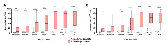 First, it is important to establish the optimal protein concentration for maximal cellular and specific activation for each allergen, Pru p 3 [26]. Thus, we performed dose–response curves with 16 healthy controls and 92 LTP-allergic patients at seven Pru p 3 concentrations (from 0.1 to 0.0000001 μg/mL) to challenge the basophils in vitro. The expression of basophil-specific CD63 was significantly increased in LTP-allergic patients versus controls in a dose-dependent manner of Pru p 3 from 0.0000001 μg/mL up to 0.001 μg/mL followed by a plateau (Figure 2A). Likewise, similar behavior was observed in the expression of CD203c (Figure 2B). We detected that the optimal discriminating concentrations of Pru p 3 were the three highest (0.001, 0.01, and 0.1 μg/mL), which were selected for further analysis.
