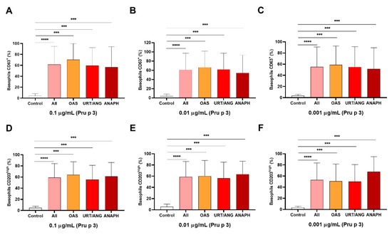 Then, we tested whether BAT parameters could differentiate among severity groups (OAS, URT/ANG, and ANAPH). We observed that %CD63+ values were significantly higher in patients (p < 0.0001) and in all different severity groups (p < 0.001), compared to controls in the three concentrations of Pru p 3 established (Figure 3A–C). This pattern was similar to %CD203chigh values (Figure 3D–F). However, these BAT parameters did not differentiate among the clinical groups (Figure 3A–F).