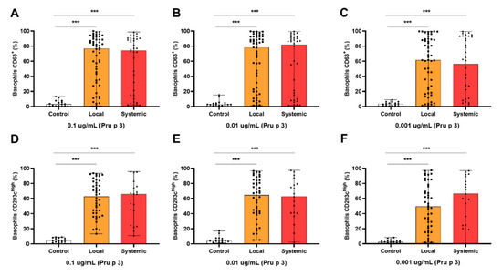 BAT parameters did not differentiate patients grouped according to symptoms’ location. Comparisons of BAT parameters %CD63+ (A–C) and %CD203chigh (D–F) were also made among controls and patients with local or systemic symptoms at the three selected concentrations of Pru p 3 (0.1, 0.01, and 0.001 µg/mL). BAT parameters %CD63+ and %CD203chigh were significantly higher between patients with local or systemic symptoms in comparison to healthy controls. However, no changes were found in basophil activation between LTP-allergic individuals with local or systemic reactions. *** p < 0.001.