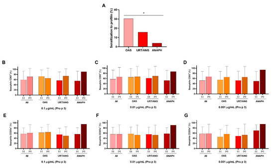 Sensitization to profilin ameliorates the severity of symptoms from LTP-allergic patients. (A) The percentage of sensitized patients to profilin was determined, showing a decrease in the number of LTP-allergic patients with sensitization to profilin in relation to the increase in severity of symptoms. Moreover, levels of %CD63+ (B–D) and %CD203chigh (E–G) were compared between LTP-allergic patients sensitized or not to profilin at the three selected concentrations of Pru p 3, not showing changes in any case. * p < 0.05. ANAPH, anaphylaxis; OAS, oral allergy syndrome; URT/ANG, urticaria/angioedema.