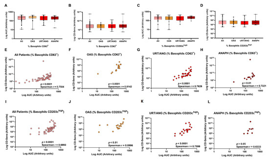 AUC and CD-Sens parameters do not distinguish clinical severity groups. (A–D) Comparisons of values of AUC and CD-Sens obtained from %CD63+ and %CD203chigh parameters. No differences were found in these BAT parameters among compared groups. Correlations between AUC and CD-Sens from %CD63+ (E–H) and %CD203chigh (I–L) were performed, showing positive significant correlations in the clinical groups. ANAPH, anaphylaxis; OAS, oral allergy syndrome; URT/ANG, urticaria/angioedema.