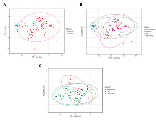 2.5. Principal Component Analysis Differentiates LTP-Allergic Patients from Controls but It Does Not Distinguish Severity Clinical Groups