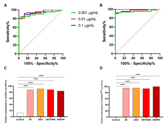 ROC curve analysis for BAT in predicting peach allergy. ROC curves of %CD63+ (A) and %CD203chigh (B) were performed at the three selected concentrations of Pru p 3 (0.1, 0.01, and 0.001 µg/mL). The positivity of patients to BAT were calculated using optimal cut-off values from %CD63+ (C) and %CD203chigh (D), not showing any differences between the severity group, but these groups and the whole allergic patients had a significantly higher percentage of positivity in comparison to healthy controls. **** p < 0.0001. ANAPH, anaphylaxis; OAS, oral allergy syndrome; URT/ANG, urticaria/angioedema.