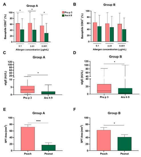 Secondly, when BAT parameters from Group A individuals were evaluated, the results showed that %CD63+ values were significantly higher in BAT performed with Pru p 3 compared to Ara h 9 in all concentrations tested (p < 0.05; Figure 9A), but not with %CD203chigh values (data not shown). Interestingly, when analyzing individuals from Group B, we found similar levels of %CD63+ in BAT performed with Pru p 3 or Ara h 9 (Figure 9B) and for %CD203chigh (data not shown). Of note, the in vitro sIgE and SPT area were significantly higher to Pru p 3 compared to Ara h 9 not only in allergic- and peanut-tolerant subjects (Group A), but also in peach- and peanut-allergic patients (Group B) (p < 0.05; Figure 9C–F).