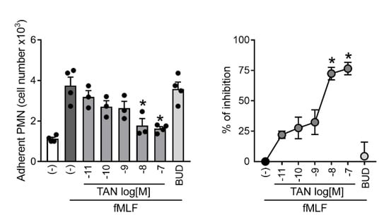 Tanimilast reduces neutrophil adherence to HUVEC monolayers. Human neutrophils, previously stained with CFSE, were incubated with the indicated concentrations of tanimilast (TAN), budesonide at 10−7 M (BUD), or vehicle (−), and then added to HUVEC monolayers in the absence or in the presence of fMLF 10−6 M. Neutrophil adhesion was assessed by counting neutrophils that remained associated to HUVEC after extensive washings, and were subsequently detached by trypsin-EDTA incubation. The left panel shows absolute cell numbers, while the right panel depicts the percentage of inhibition by tanimilast and budesonide of the neutrophil adherence found in fMLF-activated neutrophils. Dots represent the result of individual donors. * p < 0.05 One-way ANOVA followed by post-hoc test or one-sample t-test (n = 3–4).