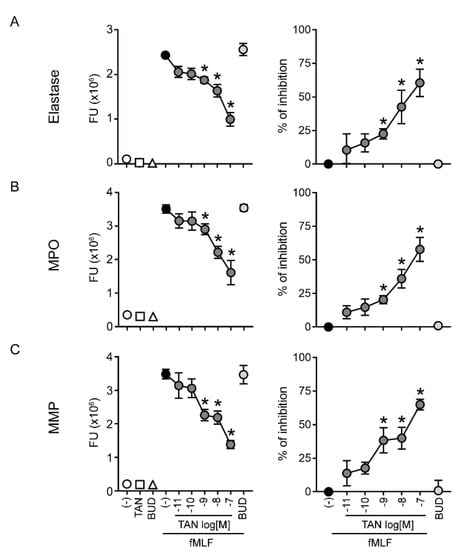 Tanimilast reduces neutrophil degranulation induced by fMLF. Human neutrophils were incubated with vehicle (−), tanimilast (TAN) at 10−7 M or as indicated, and budesonide (BUD) at 10−7 M. Degranulation was induced by fMLF treatment (2 × 10−8 M) in the presence of cytochalasin B. Granule protein release was assessed by measuring enzyme activities in cell-free supernatants, using elastase-specific (A), MPO-specific (B), or MMP-specific (C) fluorogenic substrates. Left panels show the fluorimetric readout (FU, Fluorimetic Unit) of each specific enzymatic activity in the cell supernatants, while right panels depict the calculated percentage of inhibition by tanimilast and budesonide. * p < 0.05 One-way ANOVA followed by post hoc test or One-sample t-test (n = 5).
