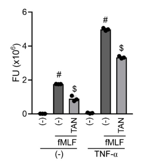 Tanimilast also counteracts elastase release by fMLF in the presence of TNF-α. Human neutrophils were incubated with vehicle (−) or tanimilast (TAN) at 10−7 M. When indicated, pretreatment with TNF-α (20 ng/mL) was also performed. Degranulation was induced by fMLF treatment (2 × 10−8 M) in the presence of cytochalasin B. Elastase release was assessed as in Figure 2. Results are expressed as fluorimetric readout (FU, Fluorimetic Unit) of elastase enzymatic activity in the cell supernatants. Percent of inhibition by tanimilast was 56.5 ± 4.5 and 33.5 ± 1.0 in the absence and in the presence of TNF-α priming, respectively. # p < 0.05 One-way ANOVA followed by post hoc test vs. fMLF untreated cells; $ p < 0.05 One-way ANOVA followed by post hoc test vs. fMLF-treated cells. (n = 3).