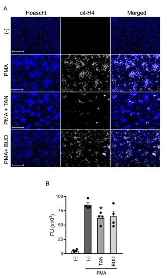 Tanimilast reduces NET production. Isolated neutrophils were left untreated (−) or exposed to PMA (100 ng/mL) in the presence of tanimilast (TAN) at 10−7 M, or budesonide (BUD) at 10−7 M. (A) NETs are identified by the association of citrullinated histon-4 (white) to DNA (blue). Scale bar: 100 μm. (B) Casted NETs were quantified in cell supernatants by analysing DNA-associated elastase activity after a limited DNase I digestion. Results are expressed as fluorimetric readout (FU, Fluorimetic Unit) of elastase activity in the cell supernatants. Dots represent the result of individual donors (n = 4). * p < 0.05% One-way ANOVA followed by post-hoc test.