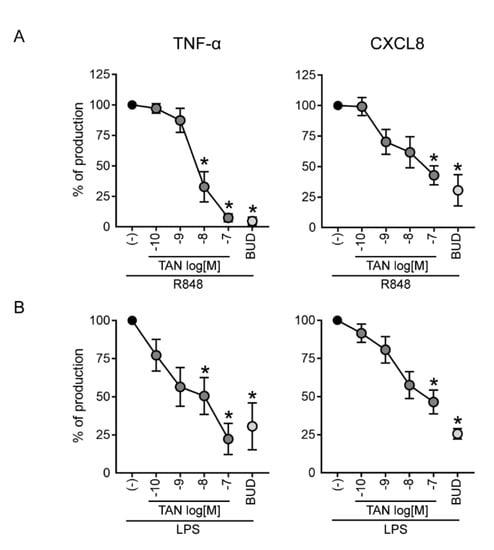 Regulation of pro-inflammatory cytokine secretion by tanimilast. Purified neutrophils were incubated with the indicated concentrations of tanimilast (TAN), budesonide at 10−7 M (BUD), and stimulated for 20 h with R848 (5 µM) (A) or LPS (100 ng/mL) (B). Graphs depict the calculated inhibition of the secretion of TNF-α (left panels) and of CXCL8 (right panels). The concentrations of secreted TNF-α were 73.7 ± 13.26 pg/mL after R484, and 24.6 ± 7.8 pg/mL after LPS; the concentrations of secreted CXCL8 were 3739 ± 702 pg/mL after R848, and 3186 ± 468 pg/mL after LPS. Results are expressed as the mean ± SEM from four independent donors. * p < 0.05 One Sample t-test.
