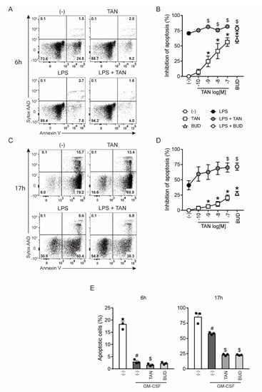 Tanimilast protects neutrophils from apoptosis. (A–D) Isolated neutrophils were exposed to the indicated concentrations of tanimilast and budesonide (10−7 M) in the absence or presence of LPS (500 ng/mL) (A–D). (E) Neutrophils were exposed to tanimilast or budesonide (both at 10−7 M) in the presence or absence of GM-CSF (20 ng/mL). Neutrophil apoptosis was assessed by cytofluorimetric analysis of Annexin V positivity in 7-AAD negative cells at 6 (A,B,E left panel) and 17 h (C,D,E right panel). (A,C) Dot plot from the analysis of one representative donor out of the four. (B,D) inhibition of apoptosis (%) by tanimilast (TAN) and budesonide (BUD), in unstimulated (open symbols) and LPS-stimulated neutrophils (closed symbols). Results are expressed as the mean ± SEM from the four independent donors. (E) Graphs depict the number of Annexin V positive in 7-AAD negative cells. Results are expressed as the mean ± SEM from three independent donors. Dots represent the result of individual donors (n = 3). * p < 0.05% One-Sample t-test; # p < 0.05% Student’s t-test; $ p < 0.05% One-way ANOVA followed by post-hoc test.