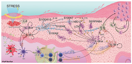 - Foster, A.M.; Baliwag, J.; Chen, C.S.; Guzman, A.M.; Stoll, S.W.; Gudjonsson, J.E.; Ward, N.L.; Johnston, A. IL-36 Promotes Myeloid Cell Infiltration, Activation, and Inflammatory Activity in Skin. J. Immunol. 2014, 192, 6053–6061. [Google Scholar] [CrossRef] [Green Version]