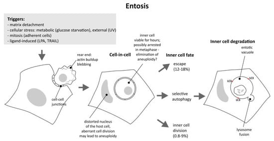 Kianfar, M.; Balcerak, A.; Chmielarczyk, M.; Tarnowski, L.; Grzybowska, E.A. Cell Death by Entosis: Triggers, Molecular Mechanisms and Clinical Significance. Int. J. Mol. Sci. 2022, 23, 4985. https://doi.org/10.3390/ijms23094985