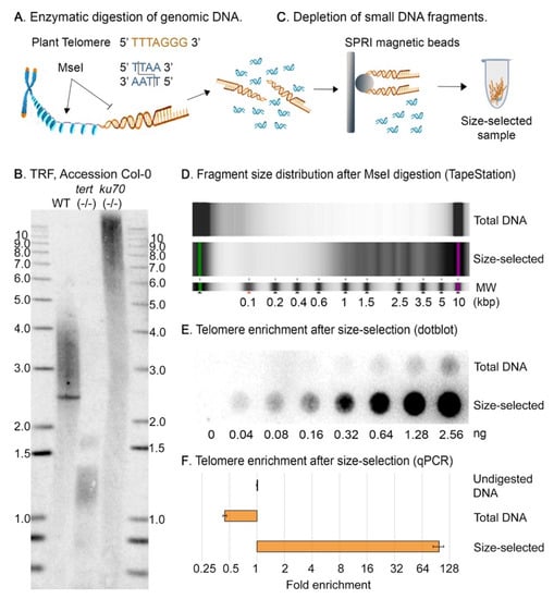 zf can be estimated by measuring telomere enrichment by qPCR, Southern blot or using the size distribution of DNA fragments as detected by TapeStation or Bioanalyzer. For the latter case, we suggest using a cutoff of 400 bp as that has been established to be the minimum length of a functional telomere in A. thaliana [,]. It is essential that telomere enrichment be calculated by measuring the telomeric fraction in the initial and final samples using the same method (Figure 1E,F, Figure S2D and Figure 2E,F).