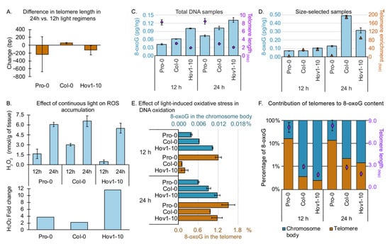 Our new assay and model to estimate telomeric 8-oxoG provide an opportunity to test the long-standing hypothesis that telomeres are hotspots for DNA oxidation [,]. Telomeres have a higher GC content than the rest of the genome. For example, the GC content of mammalian telomeres is 50% GC versus ~41% in the genome [], while plant telomeres stand at ~42% CG versus ~36% genome-wide []. In addition, telomeres are highly dynamic structures that engage a multitude of protein complexes that potentially make them more susceptible to chemical modification and less accessible to DNA repair []. If it is true that telomeres are hotspots of DNA oxidation, we expect that (i) longer telomeres contribute more 8-oxoG to the genome, and (ii) telomeres gain more 8-oxoG than the genome upon oxidative stress. To examine the relationship between telomere length and 8-oxoG content, we used the wild-type accessions Hov1-10, Col-0 and Pro-0 (Figure 2). Light stress is a known inducer of ROS [], and, therefore, we exposed the three accessions to two different light regimens for a period of two weeks: a control 12:12 h light:dark and a stress-inducing 24 h of constant light (Figure 3A,B). If telomeres are hotspots of DNA oxidation, we predict that the longer telomeres in the Pro-0 accession will contribute more 8-oxoG to the genome than the shorter telomeres in Hov1-10, and that the 8-oxoG content upon oxidative stress would increase more at telomeres than in the chromosome body.