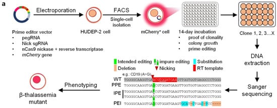 According to the manufacturer’s instructions, the electroporation was performed using the 20-μL Strips of the Celetrix basic model (Celetrix, Taizhou, China). 1x106 cell HUDEP-2 cells resuspended in 20 μL of electroporation buffer were mixed with 1 μg PE3 plasmid and transferred to a cuvette for electroporation with the program of 380 V/30 ms. The cells were transferred to the HDUEP-2 proliferation medium immediately after electroporation and maintained in a humidified atmosphere of 5% CO2 at 37 °C. Forty-eight hours later, the microscope examination was performed for checking reporter gene mCherry expression. The single-cell fluorescence-activated cell sorting was then performed, and the mCherry+ cells were sorted into the 96-well plates with 150 μL proliferation medium per well and cultured in a humidified atmosphere of 5% CO2 at 37 °C. After 14-day incubation, the microscope examination was performed for checking reporter gene mCherry expression and colony growth. The colony was selected and transferred to the 48- or 24-well plates for further proliferation.