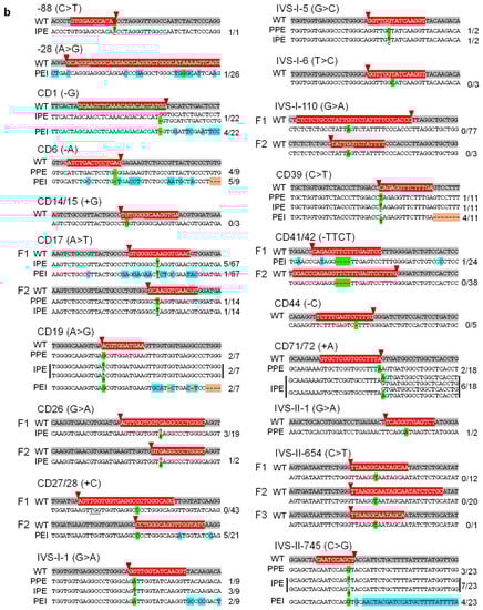 As shown in Table 2 and Figure S1c, the results illustrated that PE3 editing ratios varied depending on the specific target edits. The edits with high editing ratios were -88, CD6, CD19, IVS-I-1, IVS-I-5, CD71/72, IVS-II-1, and IVS-II-745, whereas those with low editing ratios were CD1, CD17, CD26 F1, and CD39. To optimize the editing ratio and generate desired mutations, we redesigned the PE3 constructs by changing the spacer sequence of the respective pegRNAs, adjusting the RT-template length, and modifying the nick sgRNA (Table S1). The redesigned PE3 plasmids efficiently installed on-target edits in CD17 F2 and CD26 F2, but not in IVS-I-110, CD41/42, or IVS-II-654. These editing data were further analyzed in 2.2. to optimize PE3 editing ratios.