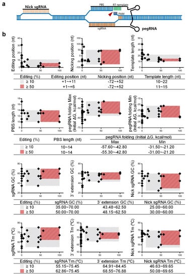 We plotted the rectangular coordinates with the editing ratio on the x-axis and each detail of PE3 formula on the y-axis (Figure 2b). These data showed that an “efficient” formula required more stringent pegRNA and nick sgRNA design including: