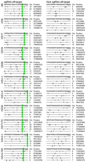 The genome DNA extraction was performed using the Hotshot method []. The off-target sites with three or fewer genomic mismatches and no bulges (sgRNA and nick sgRNA) of each beta-thal mutant were identified using the Cas-OFFinder tool []. The off-target of interests are listed in Table S3. We chose the top five off-targets and performed PCR to amplify the off-target sequences, using the corresponding primer pairs listed in Table S4 designed on the website of Primer-BLAST (https://www.ncbi.nlm.nih.gov/tools/primer-blast/index.cgi?LINK_LOC=BlastHome (accessed on 21 September 2021)). Before Sanger sequencing, all PCR products were purified using the DNA Gel/PCR Purification Kit (Novoprotein, Shanghai, China).