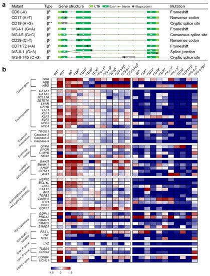 The results were plotted as a heatmap using GraphPad Prism (Figure 4b). The logarithm values of gene expression ranged from −1.5 (navy) to 1.5 (crimson), indicating that the corresponding genes were significantly down- or upregulated, respectively. After ED, most of the genes were upregulated in the WT cells, while several were downregulated, such as GATA-2, c-MYB, cyclin-A, and PRDX2 (Figure 4b). Compared to the WT, the expression levels of most genes in beta-thal cells were moderately changed before ED. However, all the beta-thal clones showed downregulated expressions of HBB and the tested genes after ED. In addition, the alpha/beta-globin (HBA/HBB) mRNA ratios relative to GAPDH analyzed by qPCR showed significant imbalance between the alpha- and beta-chains in the beta-thal clones (Figure S4). These findings are consistent with the gene expression patterns in hematopoietic stem and progenitor cells from beta-thal patients [,,,,,,,,,,,,,,,]. The downregulation of these genes during erythropoiesis may be responsible for the subsequent adverse effects relating to erythroid maturation, free alpha-globin aggregation, antiapoptosis and cell cycling-promotion, ROS resistance, and programmed cell death.