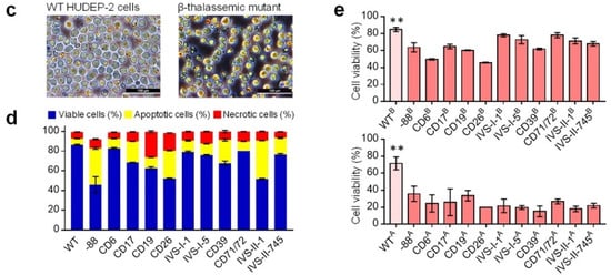 The qPCR results showed that the expression of genes associated with cell death receptors fluctuate significantly in beta-thal cells before ED (Figure 4b), suggesting that programmed cell death is abnormal in those cells. We performed a microscopic examination and apoptosis analysis of abnormal apoptosis and cell death processes. The WT cells were chubby and spherical, whereas the beta-thal cells showed disparate sizes, and more necrotic cells were visible (Figure 4c). The apoptosis analysis showed that the beta-thal cells had a higher ratio of apoptotic and necrotic cells (Figure 4d and Figure S3d,e) and was consistent with the observations from patient-derived beta-thal hematopoietic stem and progenitor cells [,,,,].